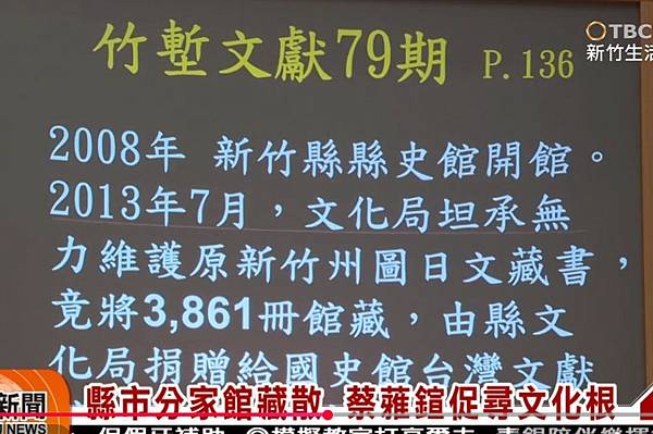 蔡蕥鍹強調,州圖藏書從1945年22,000餘冊藏書,到2013年捐贈給國史館台灣文獻館3,861冊,10年間流失近2萬冊館藏,「縣史館是否盡到蒐集、典藏、保護、研究新竹文史的責任?為何在開館後仍將核心史料移送他處?文化局竟完全不知情! 相當離譜!」