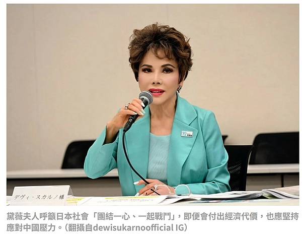 黛薇夫人呼籲日本社會「團結一心、一起戰鬥」,即便會付出經濟代價,也應堅持應對中國壓力。(翻攝自dewisukarnoofficial IG)