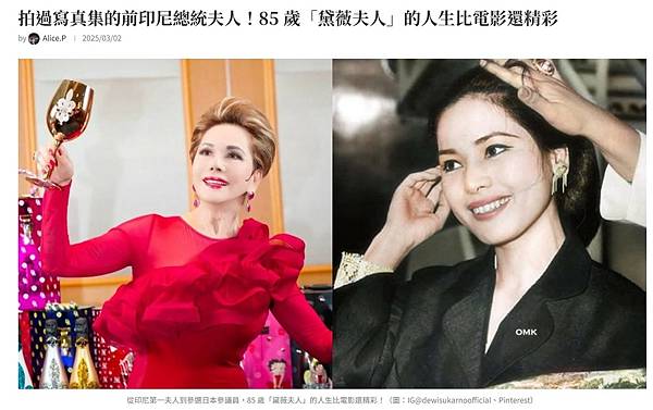一路走來,從印尼第一夫人到日本綜藝圈最強貴婦,再到如今進軍政壇,黛薇夫人的人生可說是超展開!這一次,她能否再度顛覆大家的期待,為社會帶來改變?讓我們拭目以待吧!"拍過寫真集的前印尼總統夫人!85 歲「黛薇夫人」的人生比電影還精彩 - iLady 愛女也|國際女性媒體 - 日日為妳添一點愛" https://ilady.life/ratna-sari-dewi-soekarno-story/