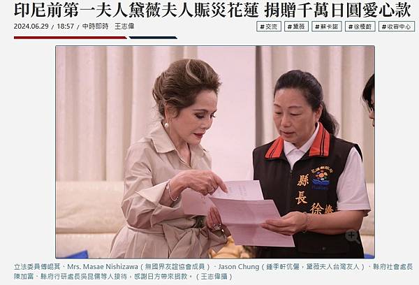 印尼前第一夫人黛薇夫人賑災花蓮 捐贈千萬日圓愛心款 - 生活 - 工商時報