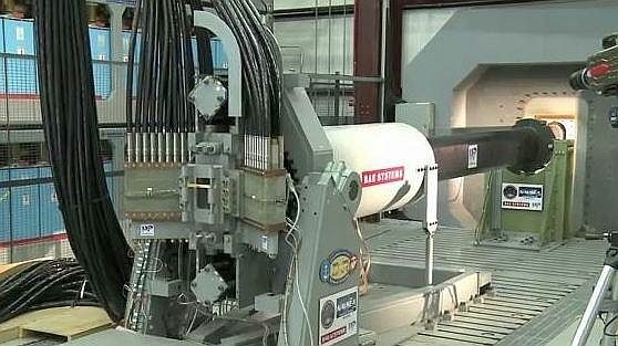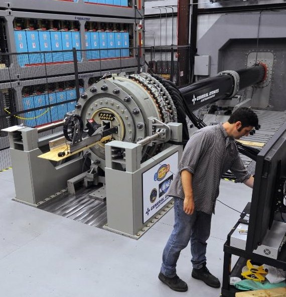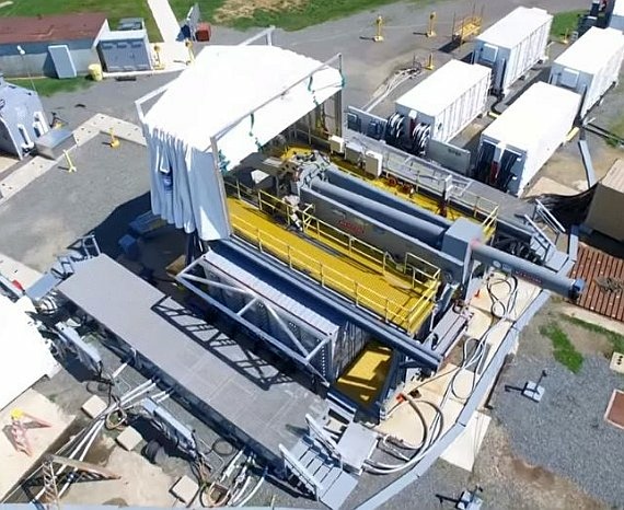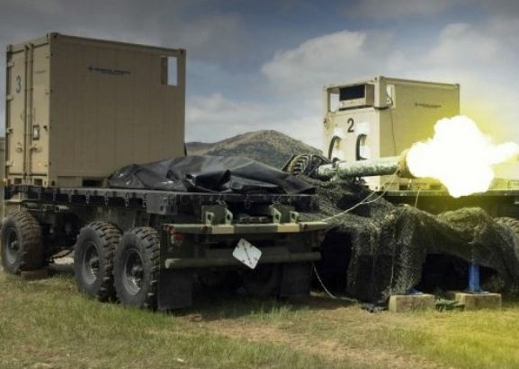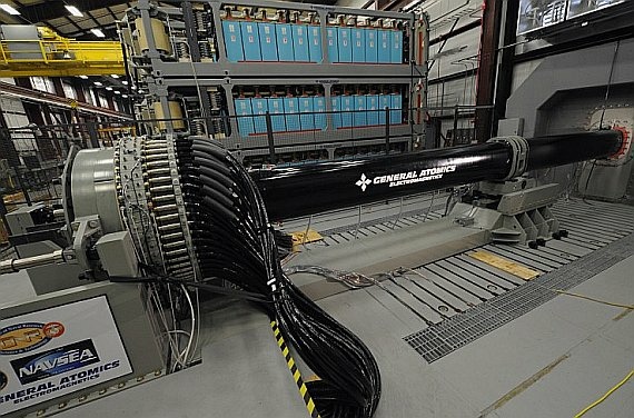 通用原子的電磁砲系統(GA-EMS)的第一階段3MW原型進行陸地測試的畫面。