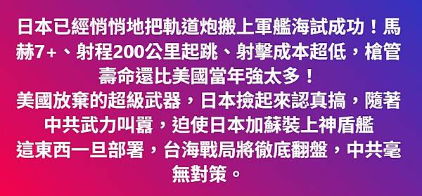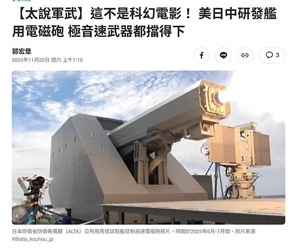 "日本電磁砲發展順利贏在「這項」技術 專家:看好打擊極音速飛彈 - 自由軍武頻道" https://def.ltn.com.tw/article/breakingnews/5022184