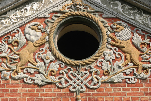 徐宅外飾以彩色泥塑和洗石子為主,側面木形直的山牆馬背則以洗石子的技法與配色做出立體的雕塑感,令人印象深刻。