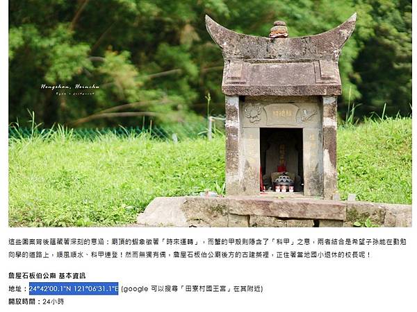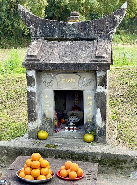 他說,這座伯公廟興建時間已不可考,但田野調查時,84歲詹姓耆老說,小時候就有這間小廟,兒時還調皮地爬上廟頂玩耍,因此估計至少超過84年的歷史。