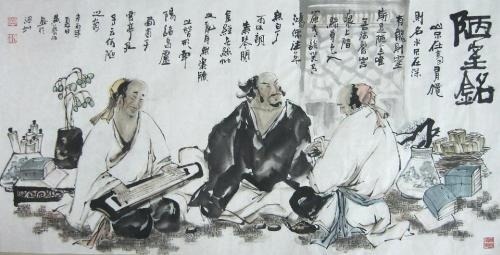 接下去“苔痕上階綠,草色入簾青。淡笑有鴻儒,往來無白丁。可以調素琴,閱金經。無絲竹之亂耳,無案牘之勞形。”完全是作者對於道德品質高尚之 士的生活總結。在前面幾句的生花妙筆明了作者的誌趣後,讀者的思緒也進入了佳境,此時明理,讀者更易接受作者的思想。他以苔痕上階綠的淡雅之色,隱寓作者 的恬淡之心,又馬上以青色入簾青的生機盎然點明恬淡中充滿生機的仙活生活狀態。交朋識友,皆是同道高潔之士,撫琴研經,生活從容多滋味。遠離嘈雜的音樂, 遠離傷神的公務,這種閑暇的生活實在讓人羨慕。這種既像隱士,又存在塵世的生活方式,是道德高尚之士羨慕的,也是凡夫俗子們向往的。通過這幾句的描寫,我 們看到了是一幅神仙的生活畫卷。