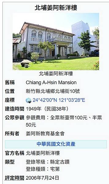 姜阿新洋樓曾見證臺灣茶業十分興旺的「茶金」時代,幾經波折,於民國95年(2006年)7月公告為新竹縣定古蹟。民國101年(2012年)由姜阿新後人購回,現以「姜阿新教育基金會」管理營運,對外開放參觀。