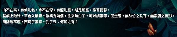 「苔痕上階綠,草色入簾青。談笑有鴻儒,往來無白丁。」陋室銘 作者:劉禹錫 / 唐
