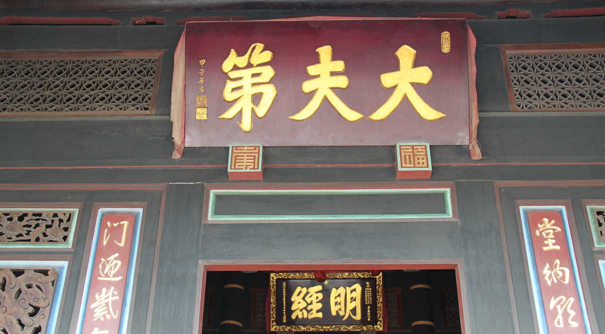 門廳大門兩側通往內護龍的側門上,樑上「一邊雕琴,一邊雕瑟」,表示「琴瑟和鳴」,下面是夔龍束木雕功細緻。「福」字門印下有一幅石雕對聯:「安仁惟宅知其所止、泰階有道奠厥攸居」,對聯框分別刻有壽桃圖形,應該表示「長壽」吧!
