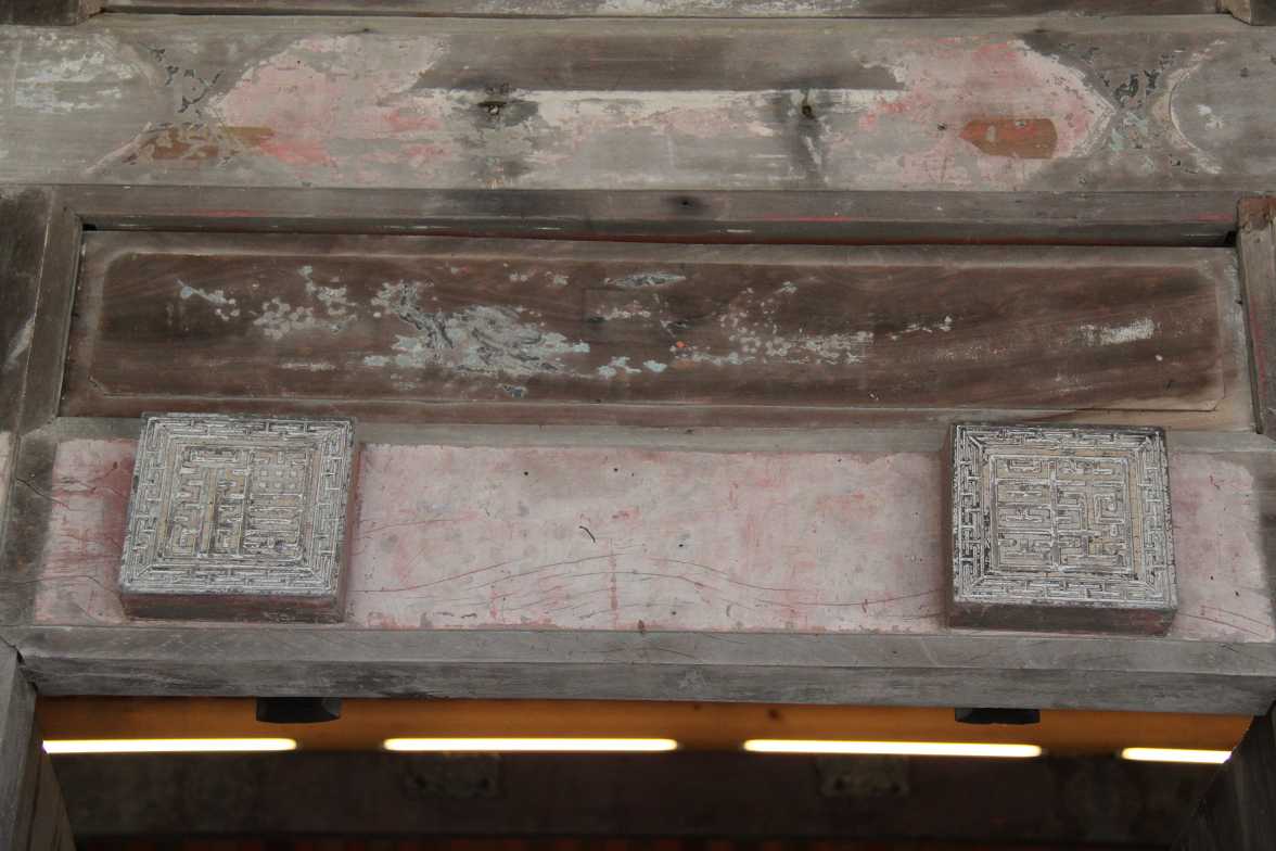 門廳大門上有「福、祿」兩個門印,「門印」的作用好像螺絲將門楣與連楹串聯起來,使連楹不致脫落,如果兩者中有一個壞了,還可以將「門印」鬆開取下,以利抽換。「門印」前端刻上福、祿與門聯上的壽桃及喜上梅稍木雕,「福、祿、壽、喜」就齊全了。