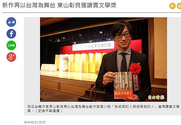 分享台裔得主東山彰良..台灣讓人非常舒服到Facebook 分享台裔得主東山彰良..台灣讓人非常舒服到Line 分享台裔得主東山彰良..台灣讓人非常舒服到Google+