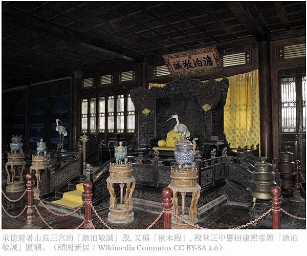承德避暑山莊正宮的「澹泊敬誠」殿, 又稱「楠木殿」, 殿堂正中懸掛康熙帝題「澹泊敬誠」匾額。(頤園新居/Wikimedia Commons CC BY-SA 2.0)