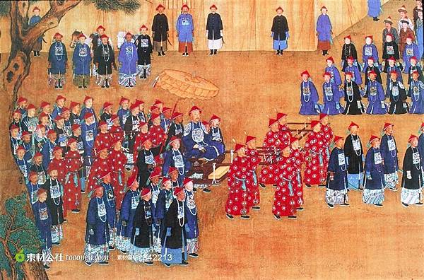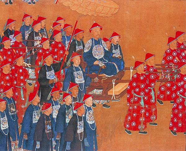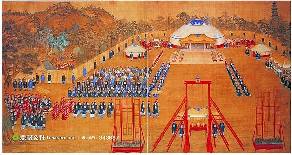 清朝郎世寧、王致誠等作《萬樹園賜宴圖》,描繪乾隆帝於避暑山莊萬樹園宴請杜爾伯特部首領的場面。(公有領域)