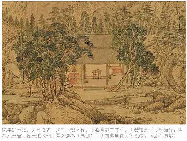 晚年的王維,素食素衣,退朝下班之後,便獨自靜室焚香,摒棄雜念,冥想誦經。圖為元王蒙《摹王維〈輞川圖〉》卷(局部),美國弗里爾美術館藏。(公有領域)