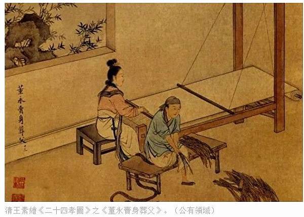 清王素繪《二十四孝圖》之《董永賣身葬父》。(公有領域)