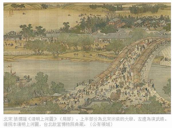 北宋 張擇端《清明上河圖》(局部)。上半部分為北宋汴梁的大學,左邊為演武場。清院本清明上河圖,台北故宮博物院典藏。(公有領域)