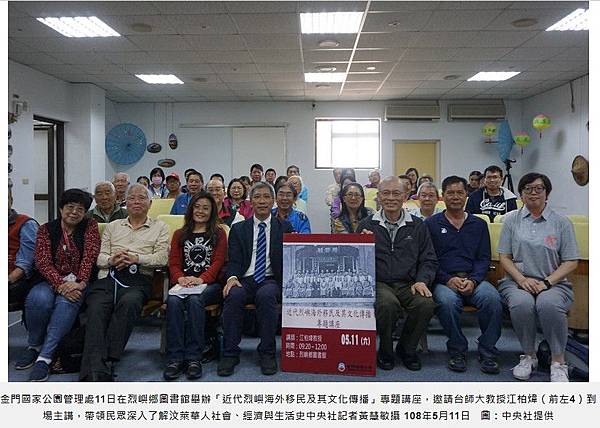 金門國家公園管理處11日在烈嶼鄉圖書館舉辦「近代烈嶼海外移民及其文化傳播」專題講座,邀請台師大教授江柏煒(前左4)到場主講,帶領民眾深入了解汶萊華人社會、經濟與生活史中央社記者黃慧敏攝 108年5月11日 圖:中央社提供
