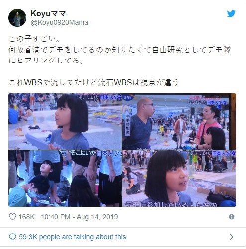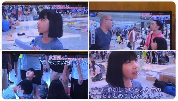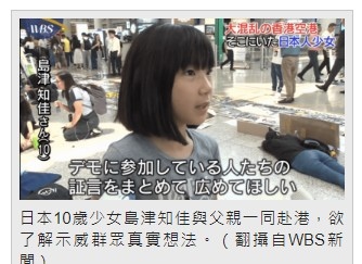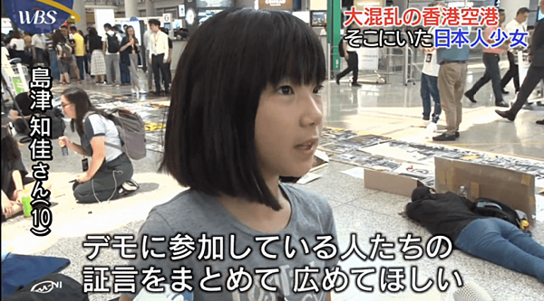 根據日媒《WBS》在14日的報導,電視台記者在香港國際機場遇到了這名10歲日本小女孩,名叫島津知佳。她同父親一起現身在機場內,並向記者表示,雖在日本看到有關香港「反送中」示威運動的新聞,但對詳細情形仍不了解,在父親的提議下,便來到香港與抗議人士進行「對話」。