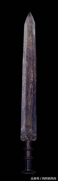 戰國青銅幾何紋平脊劍,戰國文物。長49.1cm。這把戰國青銅劍出土於餘杭區吳山鄉,色澤黑中泛青,有光澤。短臘,斜寬從,厚格呈倒凹字,格兩面各鑄陰陽簡易獸面紋。圓莖,有兩道箍,劍首鑄飾幾何紋。