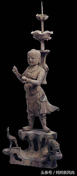 明青銅人物燭台,高64.5cm。1994年杭州市昭慶寺舊址出土。1994年工作人員在清理昭慶寺舊址時,在門口的古井中發現了一批的銅器。這批銅器的出土,填補了杭州銅器史的空白。青銅人物燭台,由插、童子、座組成。童子上身赤裸,佩項飾,背負花口瓶,上插荷葉形燭台,手呈持物狀。下身著裙,足蹬高靴,立於水紋托起的平台上,前方左右各立一瑞獸。人物造型生動寫實,栩栩如生,體現了較高的工藝水平。