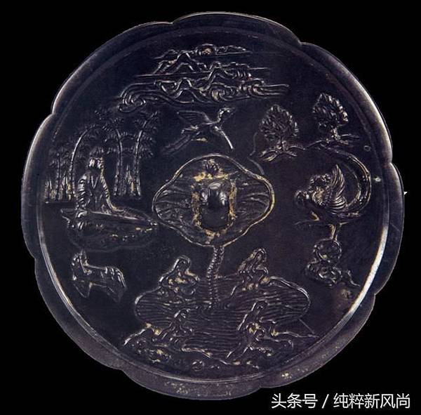 唐青銅真子飛霜鏡,唐代文物。直徑16.2cm,厚0.6cm。鏡背上方飾雲山日出紋,下方飾有山石池水,一枚碩大的荷葉自池中伸出,上伏一龜,形成鏡鈕及鈕座。左側一片竹林前有一人席地坐於獸皮之上,身著長袍,膝上橫一琴,作彈撫狀,其前置長方幾,上有筆、硯、書卷等物。右面一鳳凰展翅抬足作舞蹈狀,鳳上方有果樹兩株。這枚鏡主題紋飾是時人對魏晉時期玄學的重要代表人物嵇康理想世界的形象表述。