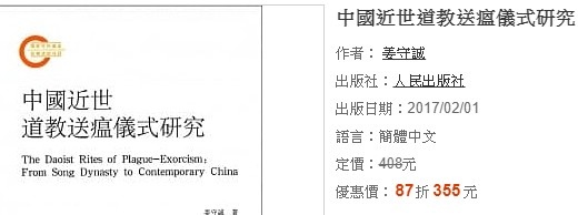 《中國近世道教送瘟儀式研究》是姜守誠有關宋元時期至到當代道教送瘟儀式的研究,尤其是閩台地區送瘟船的儀式。