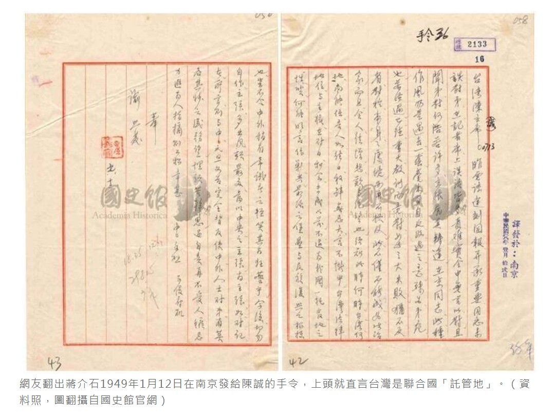 網友翻出蔣介石1949年1月12日在南京發給陳誠的手令,上頭就直言台灣是聯合國「託管地」。(資料照,圖翻攝自國史館官網)